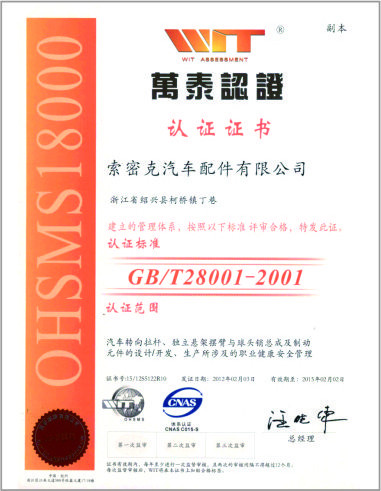 公司已先后通過IATF16949質量管理體系認證、ISO/14001環境管理體系認證和OHSAS18001職業健康安全管理體系認證。是“國家高新技術企業”“行業龍頭企業”和“全國百家優秀汽車零部件供應商”。